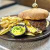Churrasco de vacuno con tocino ahumado, huevo de campo frito, papas hilo y salsa rustica. Todo en pan brioche y acompañada de papas rústicas.