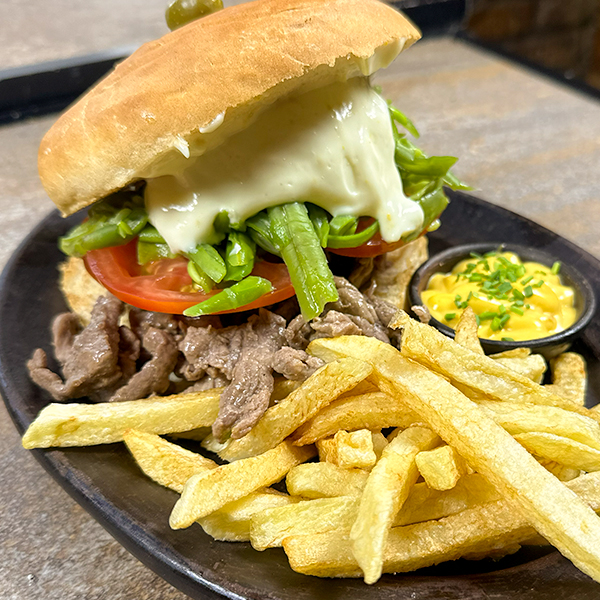 Churrasco de carne, tomate, palta, lactonesa. Todo en pan frica, acompañada de papas fritas y salsa cheddar en pocillo